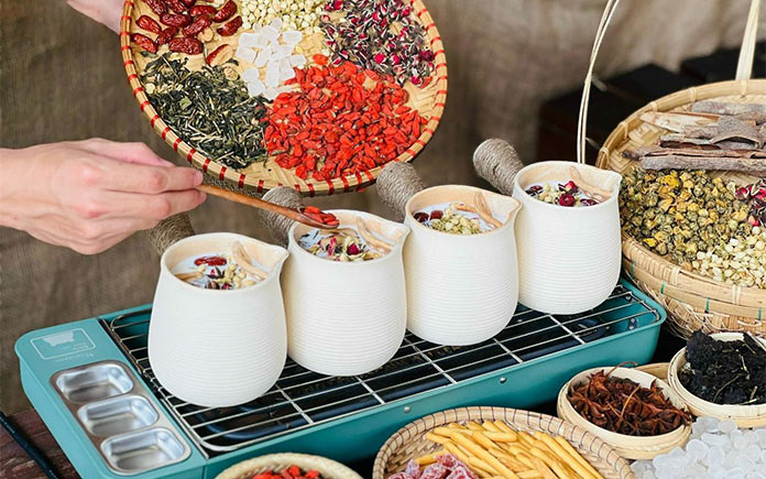 Các nguyên liệu để nấu trà sữa chủ yếu là các loại thảo mộc như nhài, cam, dâu tằm, quế hoa, đậu biếc, long nhãn, đông trùng, kỷ tử, táo đỏ, hoa cúc, hồng... nhập khẩu từ Trung Quốc.