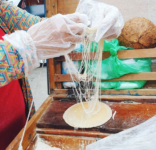 Kẹo chỉ hồng thường được ăn cùng lớp bánh tráng mềm xốp, kết hợp phần dừa nạo thơm béo, đậu phộng và một chút sữa đặc là có thể thưởng thức.