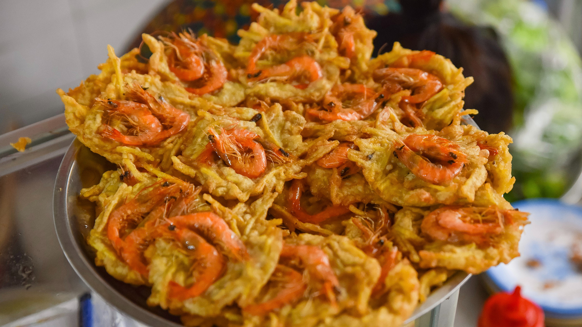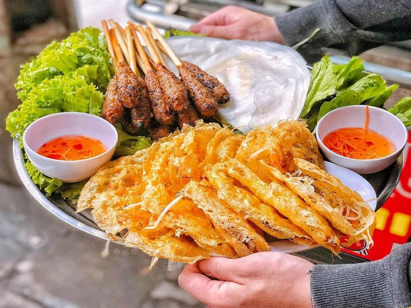 Món bánh tôm Hồ Tây nổi tiếng trong ẩm thực Hà Nội, có tôm nhỏ chiên giòn bên trên bột dầy, ăn kèm cùng nước mắm chua ngọt, rau sống và dưa chua.