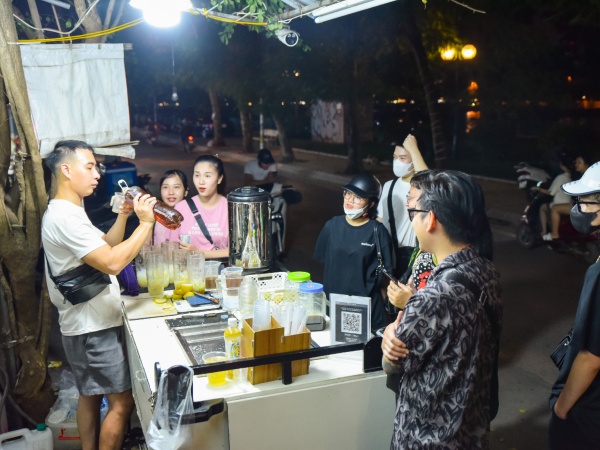 Đi qua đoạn đường Quảng Bá (quận Tây Hồ, Hà Nội) nhiều người tò mò khi từ xa đã nghe thấy âm thanh của tiếng giã đá, tiếng lắc trà và ngửi thấy hương chanh thoang thoảng từ một quầy hàng vỉa hè đông đúc khách.