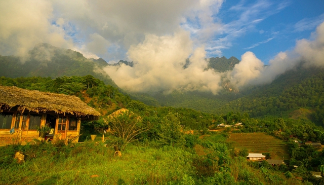 Đó đều là những ngôi nhà gỗ được xây tựa vào núi, phía trước là thung lũng, bên trong có những chi tiết mang đậm nét văn hoá bản địa. Mùa xuân, hoa đào nở rợp cả góc sân khiến cảnh vật càng thêm thơ mộng, hữu tình.
