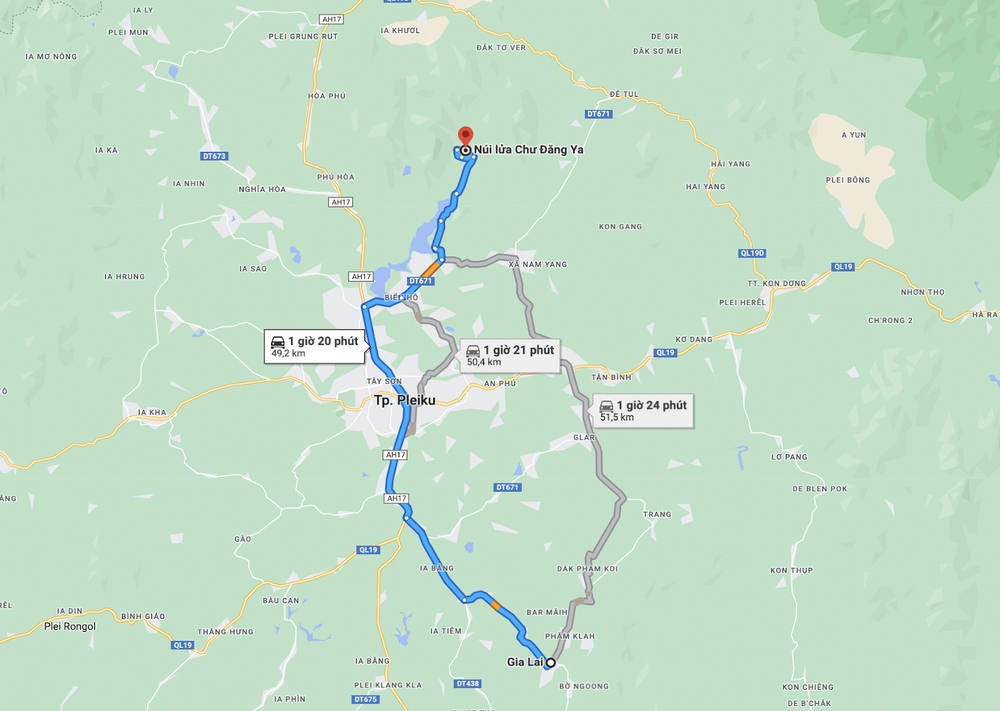 Có nhiều đường để di chuyển đến đây nhưng thuận tiện và dễ dàng nhất là đi theo hướng đường Phạm Văn Đồng đi Chư Pah rẽ vào đường Lê Văn Sỹ đến Biển Hồ chè. Từ Biển Hồ chè, gần chùa Bửu Minh, du khách chạy lên một đoạn và nhìn sang phía tay trái sẽ có bản hướng dẫn đường vào núi lửa Chư Đăng Ya. Đi theo bản đồ hướng dẫn này sẽ tới được điểm đích. Theo chỉ dẫn của bản đồ trực tuyến trên thiết bị điện tử, tổng thời gian di chuyển sẽ khoảng hơn 1 giờ đồng hồ.
