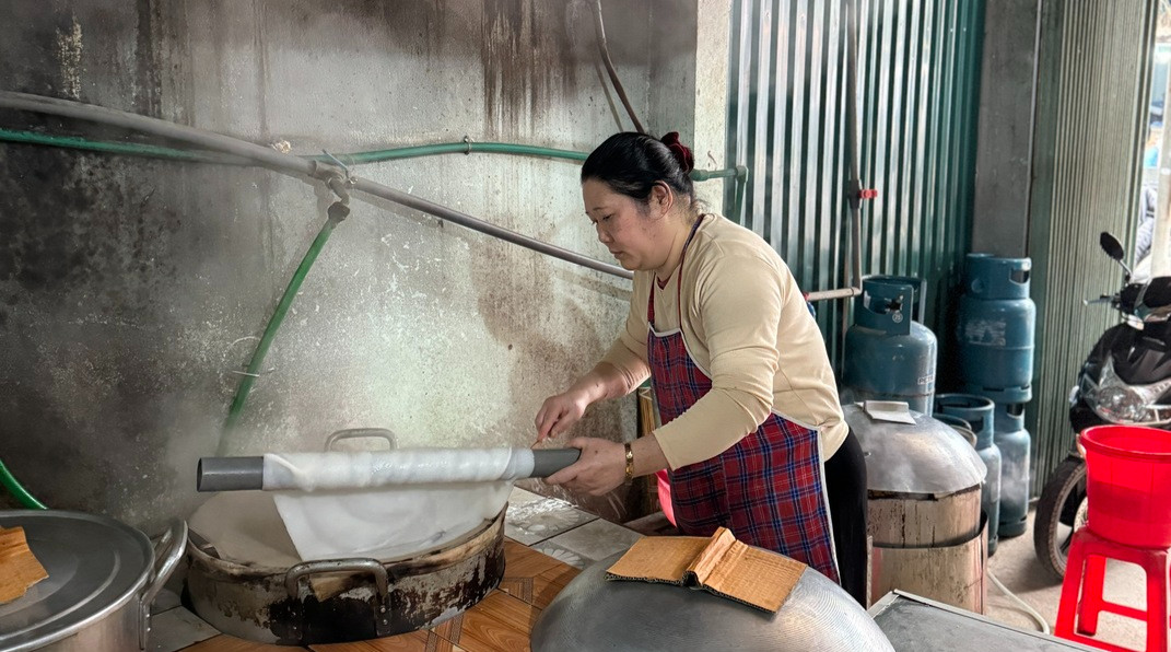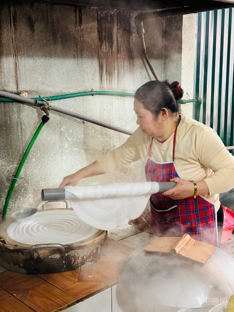 “Bình thường khi làm bánh phở sẽ phải có một công đoạn nữa là khi gỡ bánh phở ra sẽ treo lên sào để khô một cách tự nhiên, rồi sau đó mới gỡ xuống và thái nhỏ. Vậy nên công đoạn này còn được gọi vui là phở đi “hong gió”. Tuy nhiên khi đông khách, mình cũng không kịp phơi lên nữa mà phải phục vụ luôn.”, chủ quán phở chia sẻ.