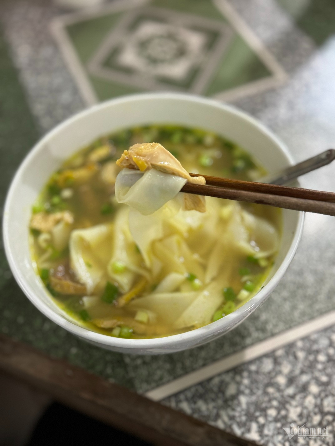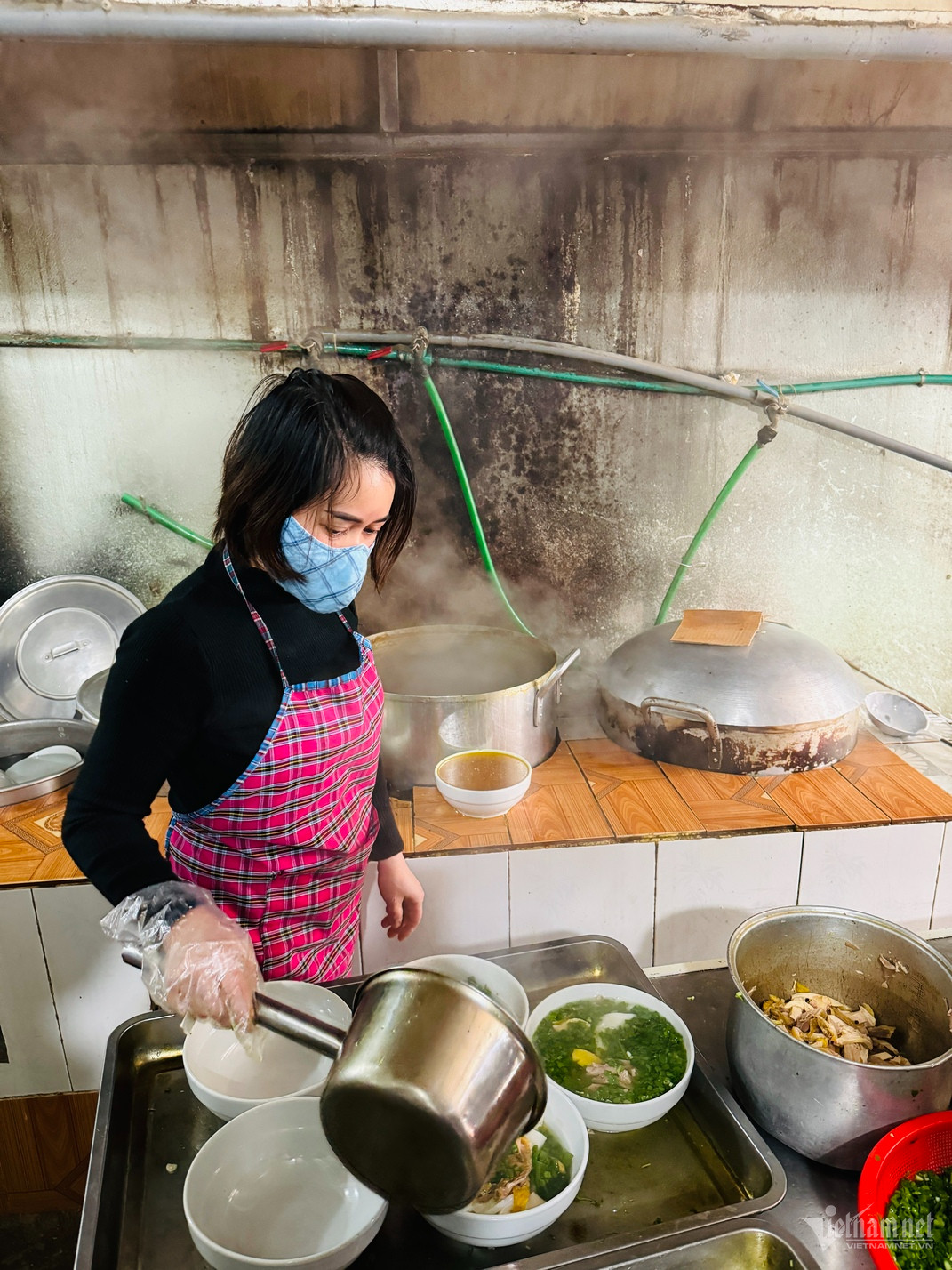 Khách đến thưởng thức, quán sẽ xếp bánh phở vào từng bát tô lớn, sau đó cho thêm thịt già, rắc thêm ít hành hoa thái nhỏ, cuối cùng là chan nước dùng nóng hổi.