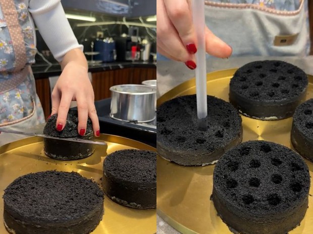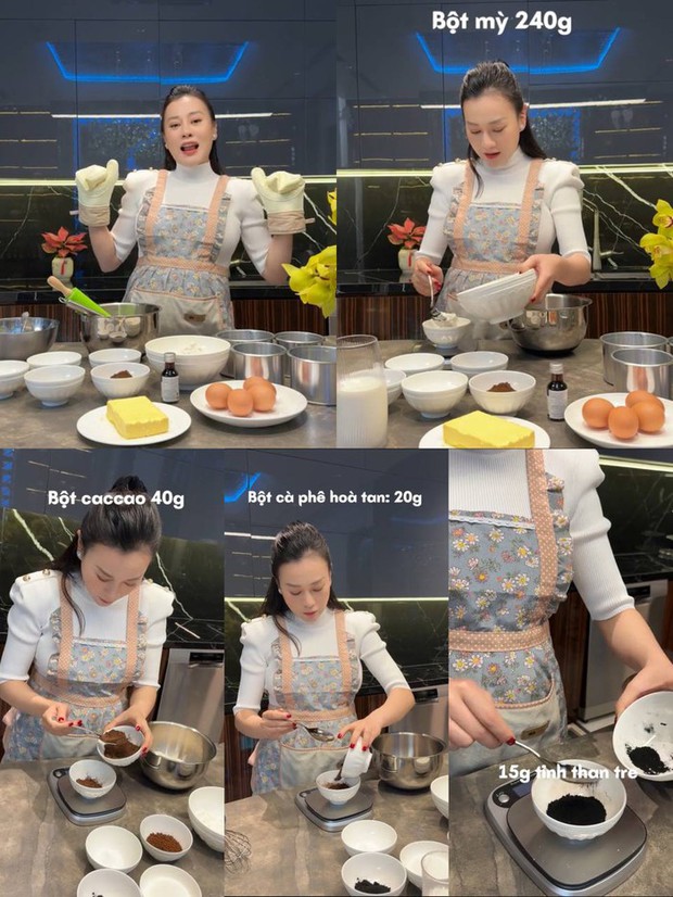 Khác với cách nấu các món ăn mặn thông thường có thể nêm nếm tùy khẩu vị nhưng đối với làm bánh thì nữ diễn viên cho rằng quan trọng nhất là định lượng phải thật chuẩn nếu không thì thành phẩm sẽ không thành công được. Thành phẩm ra lò vốn chỉ là những chiếc bánh bông lan thông thường, cô nàng đã sử dụng những chiếc ống hút trà sữa để tạo lỗ trên mặt bánh. Quả thực món bánh của vợ Chủ tịch khiến dân tình rất bất ngờ bởi giống hệt như những viên than tổ ong thật sự.