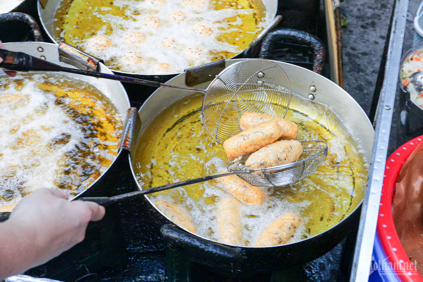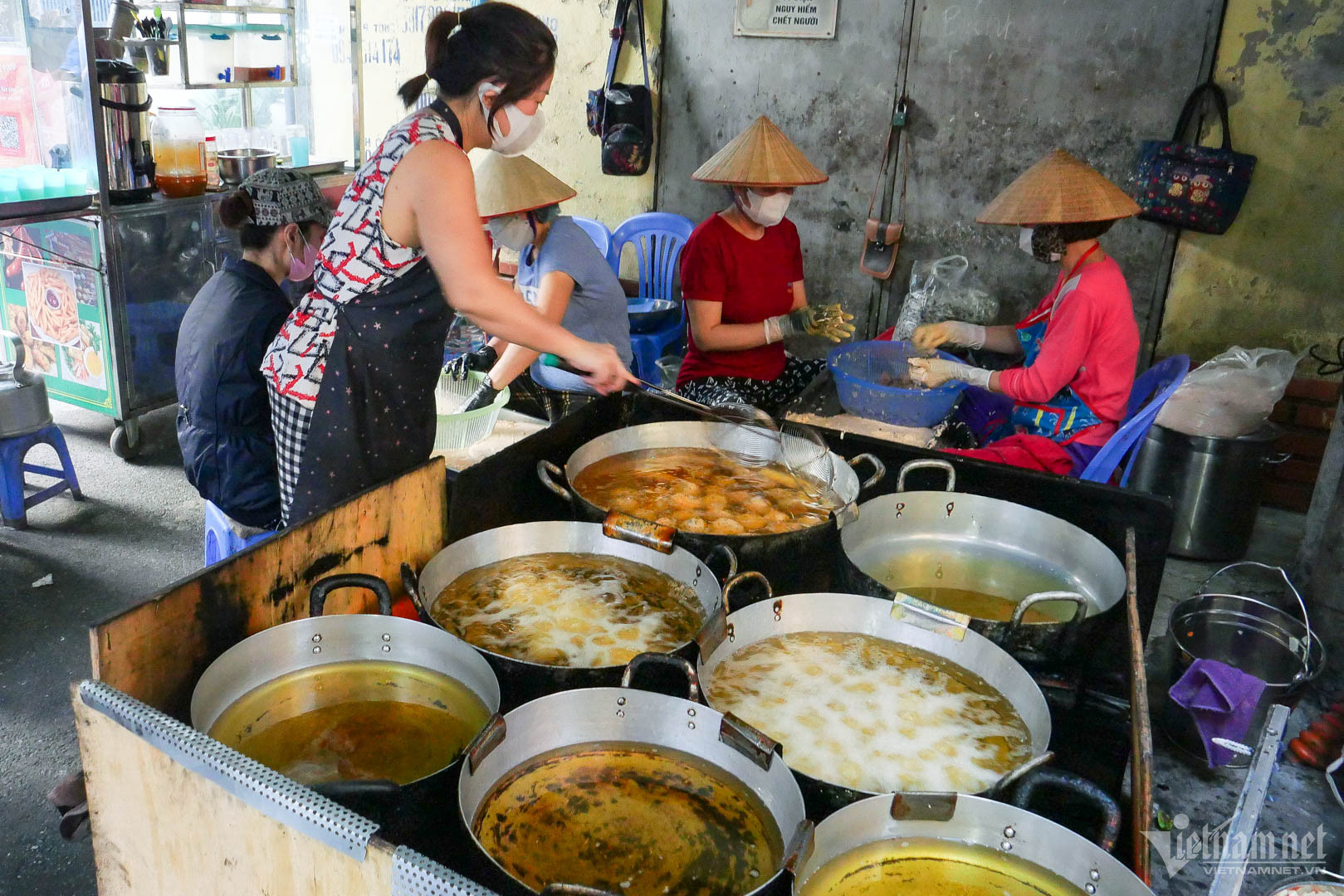 Quán tuy nhỏ nhưng lượng bếp và chảo dầu khá "đồ sộ". 7 chiếc chảo ngập dầu được hoạt động hết công suất, chiếc lăn tăn, chiếc sôi sùng sục, phục vụ các công đoạn chiên khác nhau. Góc làm bánh và chế biến "lộ thiên" nên khách nào cũng có thể quan sát.