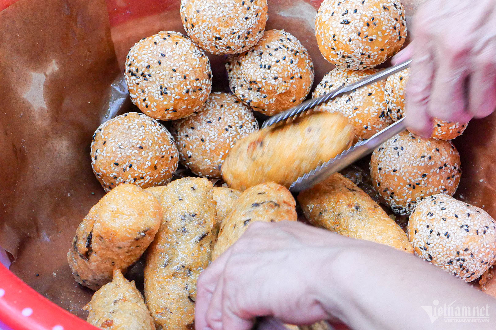 Những chiếc bánh sau khi nặn được chiên lần lượt qua 6 nồi dầu lớn, ở nhiệt độ cao đến khi vỏ vàng ruộm, giòn tan. Theo chủ quán việc rán bánh qua nhiều lượt dầu sẽ giúp bánh luôn đạt được độ nóng giòn. Vỏ bánh rán được làm từ bột nếp trộn đều cùng dầu gấc nên màu sắc bắt mắt hơn.