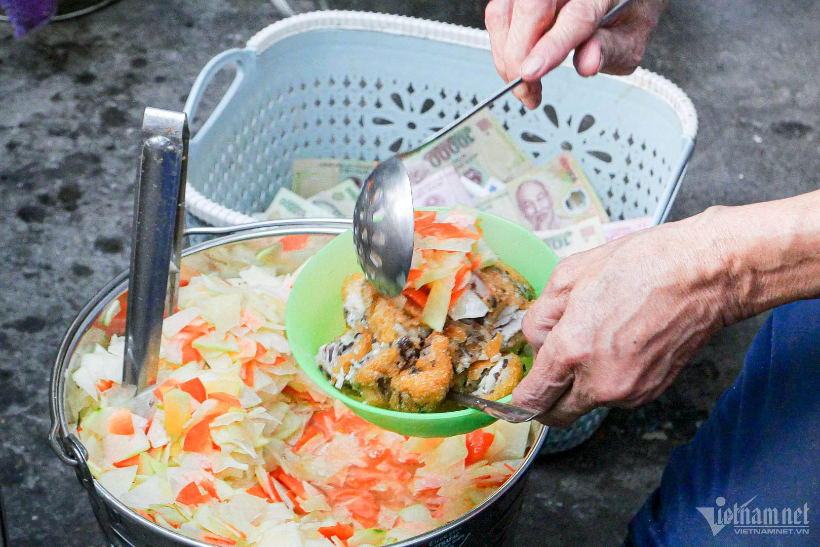 "Phần nước chấm này giúp bánh ăn hài hòa, không ngán. Đi nhiều nơi mà mình chỉ ưng ý bánh rán ở đây", anh Tuấn Anh (Bắc Từ Liêm) chia sẻ.