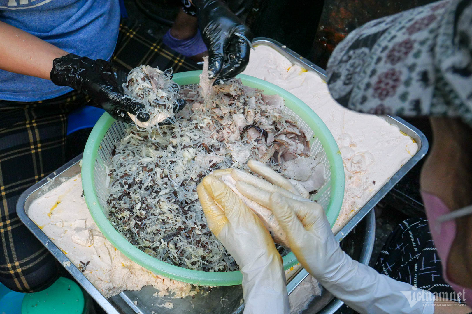 Nhân bánh được chế biến cầu kì với đủ loại nguyên liệu: miến, nấm hương, mộc nhĩ, thịt heo và các gia vị. Chị Hoa luôn tự tay chế biến nhân bánh bởi đây là phần quan trọng nhất, giúp bánh có hương vị đặc trưng, đậm đà.