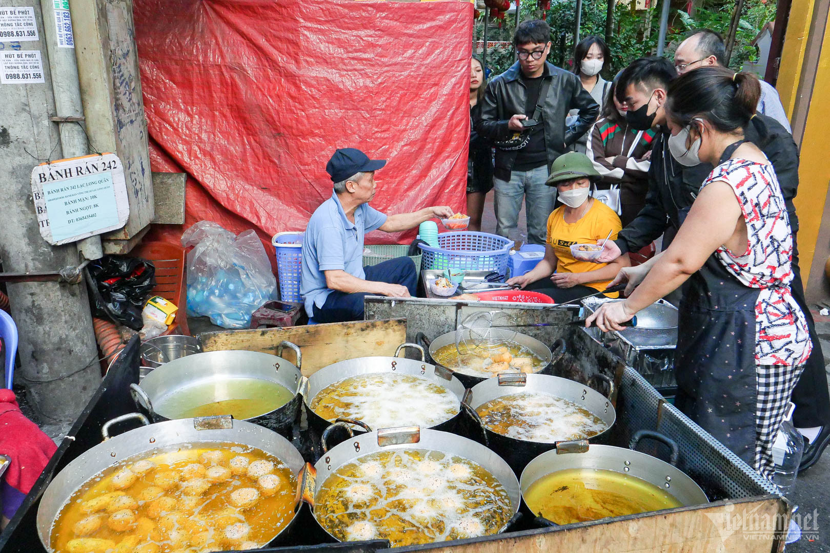 16h chiều, quán bánh rán của gia đình chị Nguyễn Thị Mai Hoa tại ngõ 242 Lạc Long Quân (Tây Hồ, Hà Nội) bắt đầu tấp nập người ra người vào. Chỉ sau 30 phút, thực khách ngồi kín những chiếc ghế nhựa đặt khép nép vỉa hè và gần quầy bếp, hơn chục người xếp hàng, nóng lòng chờ tới lượt gọi đồ. 10 thành viên trong gia đình chị Hoa thoăn thoắt làm các công đoạn, từ nặn bánh, chiên bánh, cắt bánh, đóng gói, thu tiền...