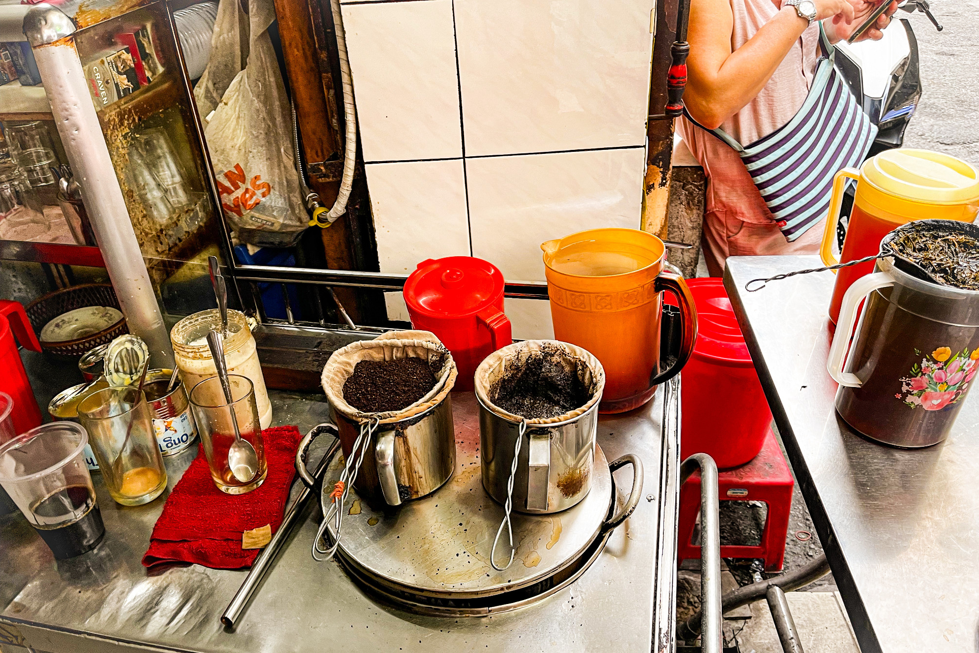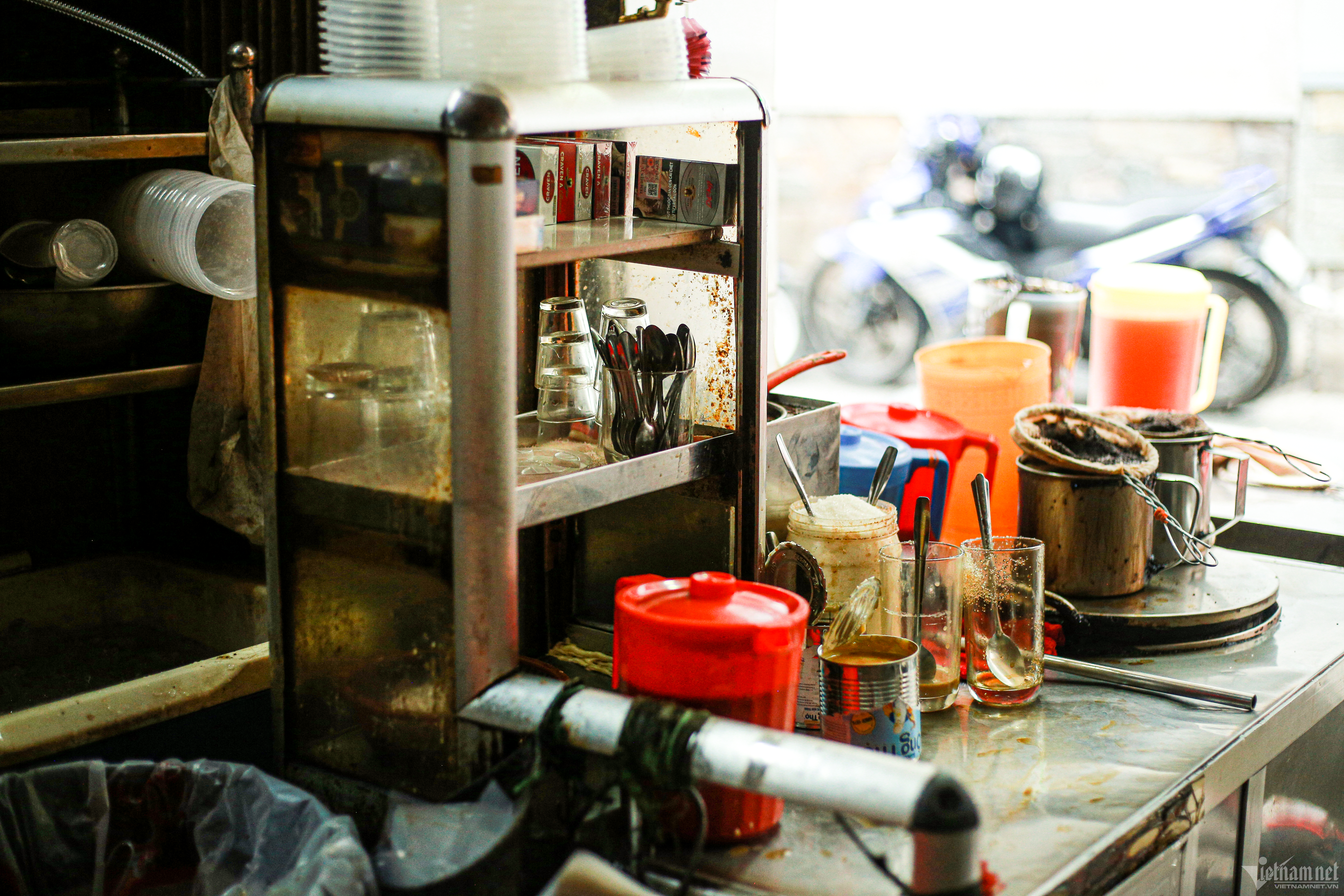 Khu vực pha chế của vợ chồng ông Mạnh chỉ là một chiếc quầy nhỏ đơn sơ. Trên quầy đặt các nguyên liệu, dụng cụ pha chế món cà phê vợt như: bột cà phê, khay đun nước, một vài chiếc vợt bằng vải, sữa tươi và một số muỗng, ly, đá đã được đập vụn.