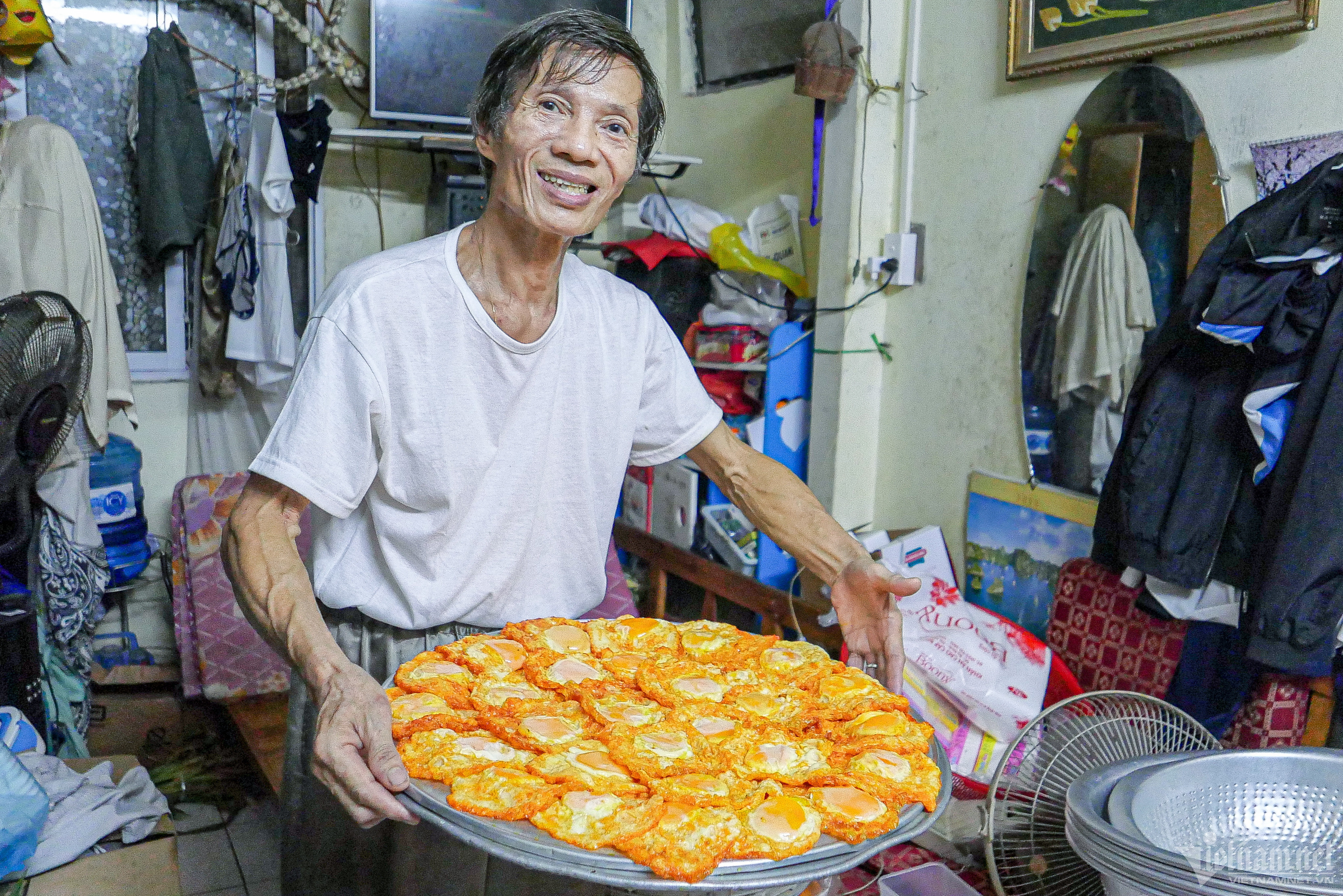 Trứng lòng đào "trăm quả như một" cũng khiến nhiều thực khách yêu thích. Lòng đỏ nằm giữa, không chín quá cũng không loãng quá, phần lòng trắng giòn, không quả nào quá lửa. Trứng có màu vàng bắt mắt từ bột nghệ tươi giã nhuyễn. Lòng đỏ khi ăn quện với xôi. Ngày cuối tuần, ông Hòa chiên và bán hết 150 quả trứng. "Thời gian để chiên mỗi quả trứng là khoảng 2 phút", chủ quán cho biết.