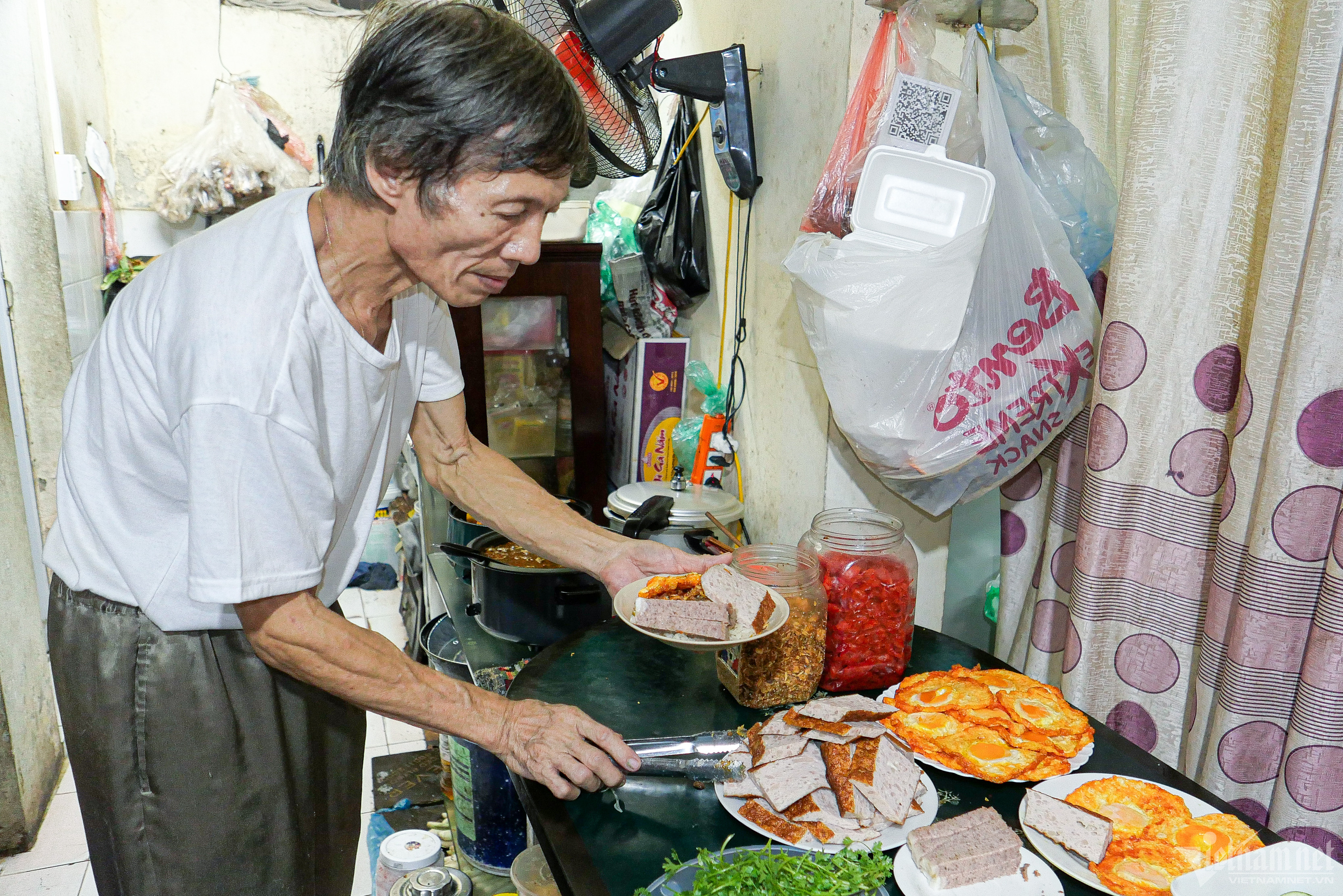 Ông Hồ Văn Hòa, chủ quán, năm nay đã gần 70 tuổi. Giai đoạn 1994-2002, ông Hòa từng bán phở gánh. Sau đó, do sức khỏe yếu, ông nghỉ bán. Đến năm 2020, gia đình ông Hòa mở lại hàng xôi ngay trước con ngõ nhỏ dẫn vào nhà. Ban đầu ông bán từ trưa tới 22h đêm nhưng gần đây, lượng khách đông hơn hẳn, chỉ tới 14-15h chiều, ông Hòa đã hết hàng. "Tôi có tuổi rồi nên chỉ làm lượng cố định, làm sao bảo đảm xôi ngon, chất lượng", ông cho biết.