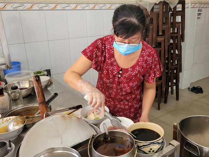 Truyền thống của quán là món hủ tiếu sa tế bò, đòi hỏi sự chế biến kỳ công. Mỗi sáng, chị Doanh thức dậy từ 5h, nhận hàng từ các mối quen rồi tiến hành sơ chế. "Nấu món này khó và cực lắm. Một mình làm không xuể, phải cần người nhà hỗ trợ", chị nói. Mỗi người trong nhà một việc từ nhặt rau, thái thịt, pha nước chấm.