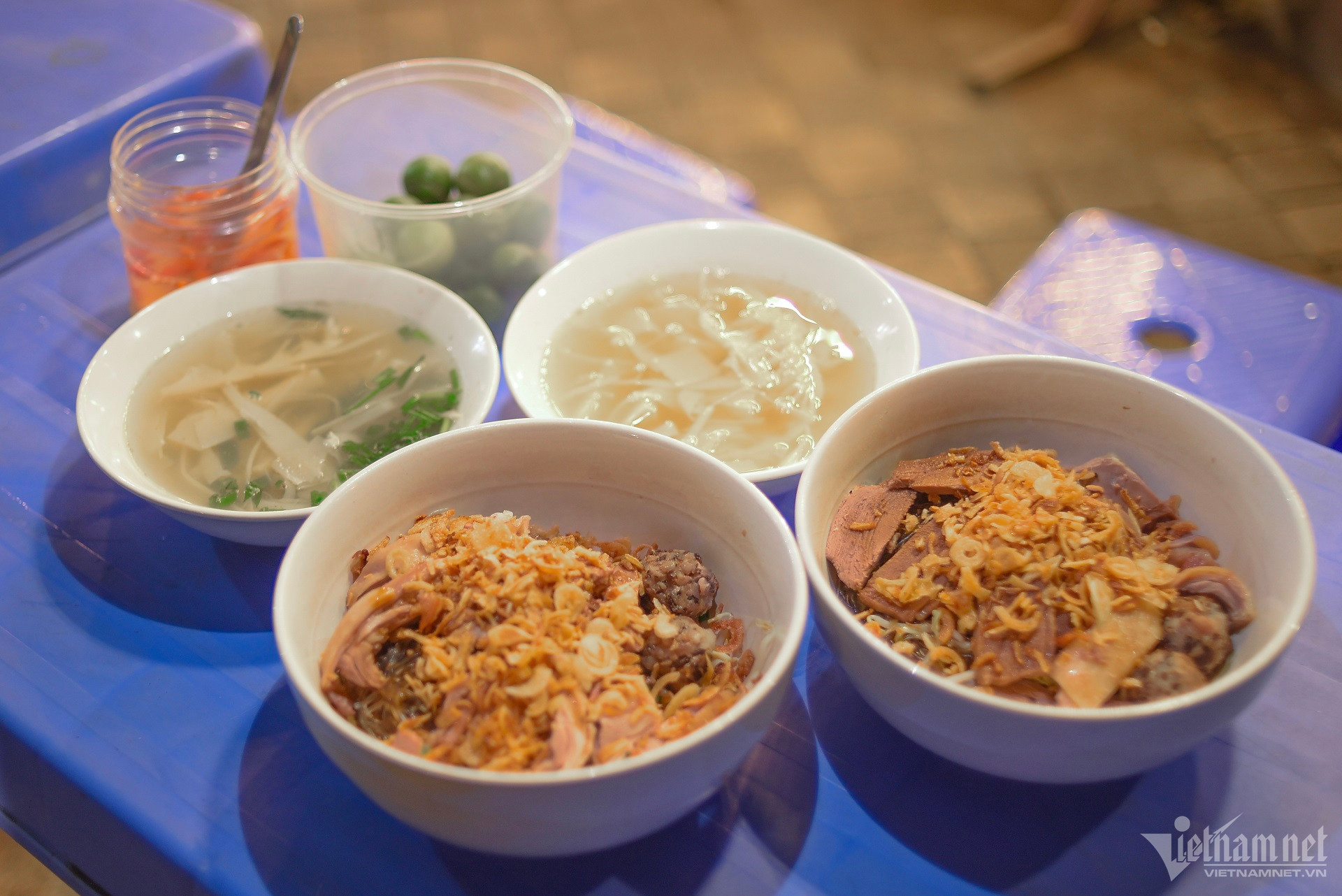 Nếu cảm thấy món ăn hơi khô, bạn có thể chan thêm nước canh măng ngọt béo được ninh từ xương và thịt ngan luộc. Sợi măng dày, giòn, trung hòa vị béo ngậy của món ăn.