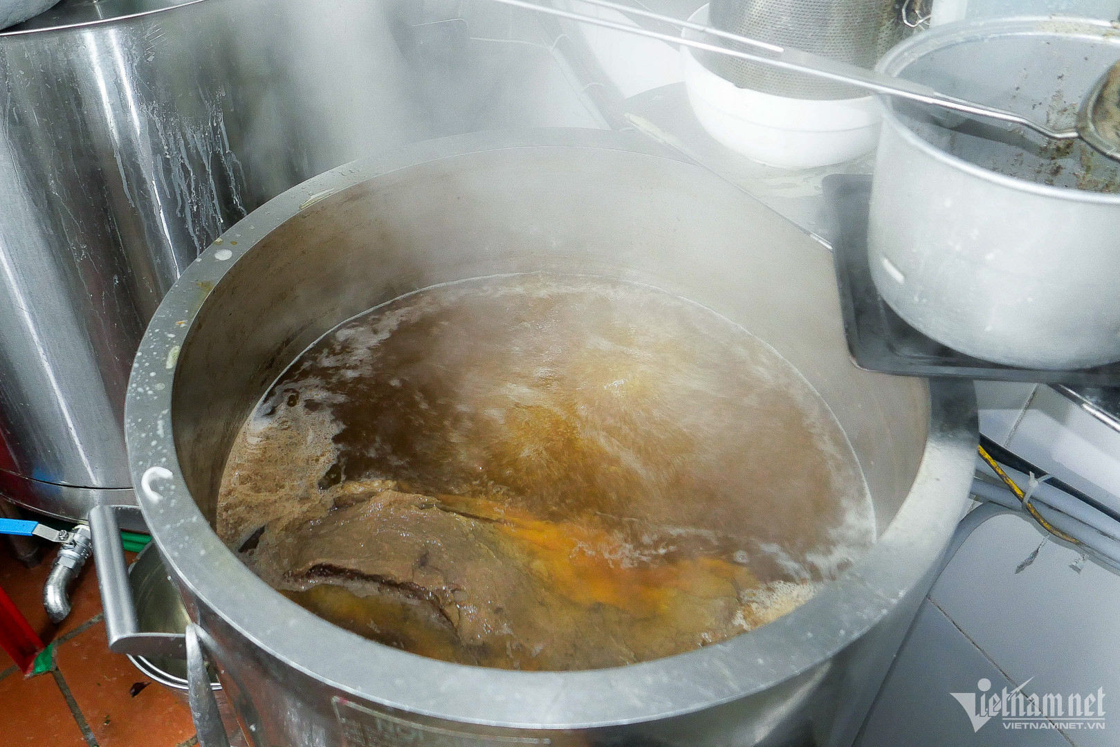 Những khách lần đầu tới quán có thể “bị sốc” bởi nồi nước dùng “siêu to khổng lồ”, cao tới cổ chủ quán. Theo chị Hoa, nồi nước dùng phở được ninh 18 tiếng. Phần xương, chị Hoa chọn loại tươi, ngon, ngâm 4-5 tiếng với gừng, chanh, muối, sau đó rửa sạch, chần với nước sôi pha rượu, gừng để khử mùi hôi. Chiếc nồi ninh được đặt làm riêng, có thể hầm 350 lít.