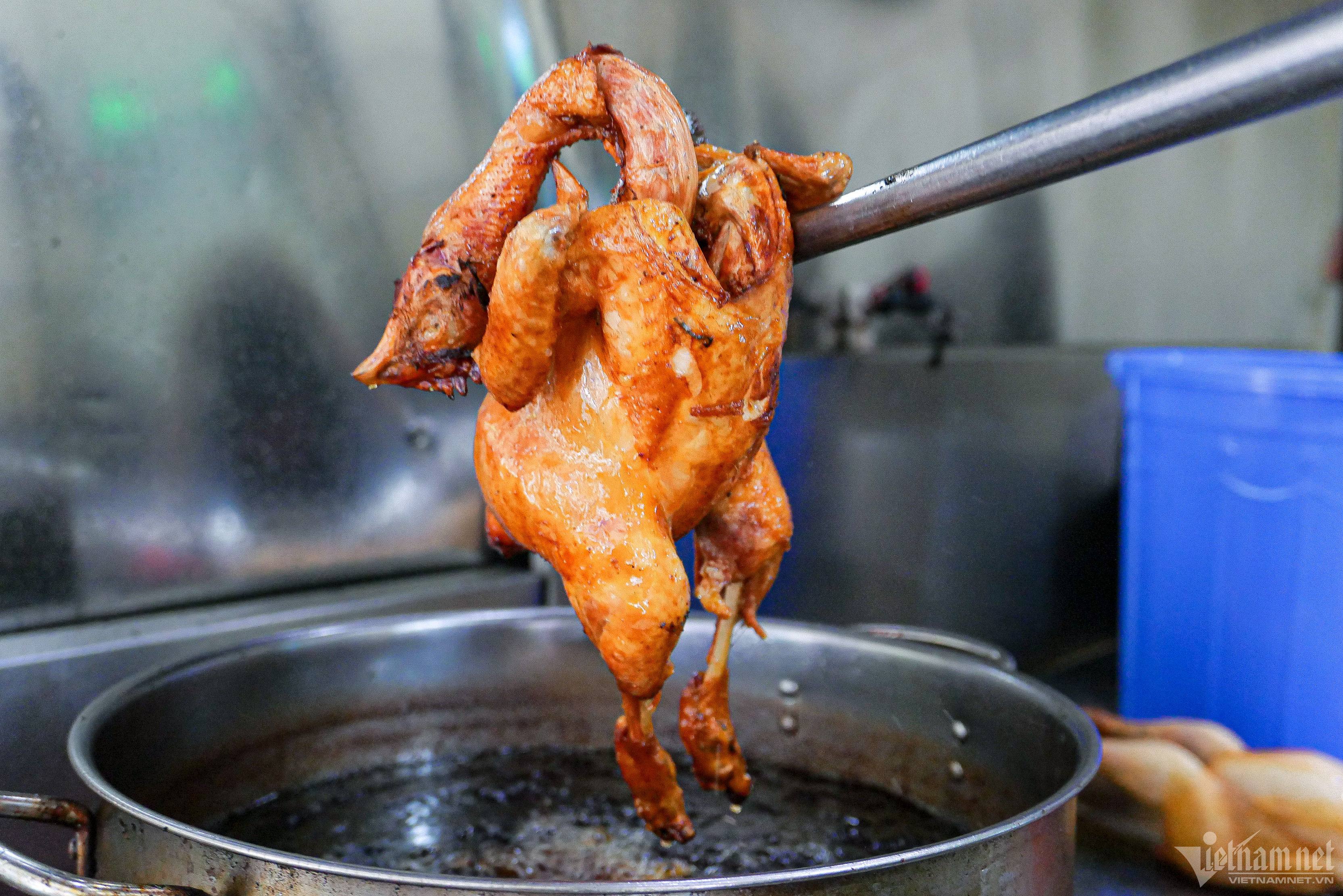 Sau khi gà được quay chín, anh Kiên tiếp tục cho gà "tắm" trong chảo dầu sôi để da vàng giòn, dậy mùi thơm. "Trải qua nhiều công đoạn, gà quay lu nhà tôi có thể giữ được độ giòn trong thời gian lâu hơn, hương vị đậm đà hơn", chủ quán cho hay.