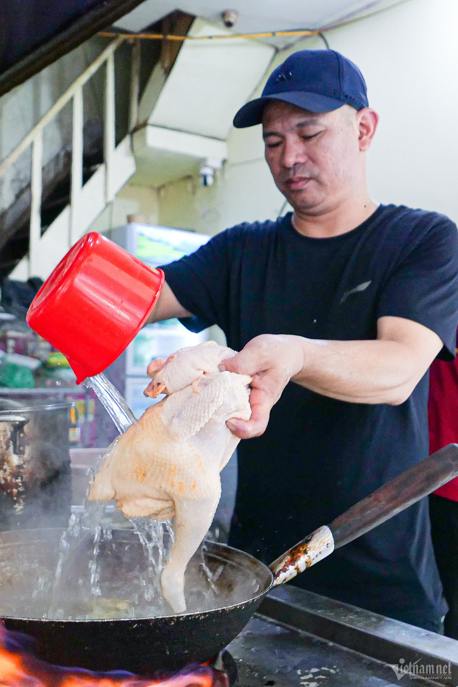 "Lượt "tắm" đầu tiên, tôi sử dụng nước đun sôi cùng gừng, giấm để loại bỏ tạp chất và giúp phần da gà căng đều. Sau khi chần qua, gà được mang để vào rổ cho ráo nước, trước khi tới bước "tắm" gia vị, dược liệu", chủ quán cho biết.