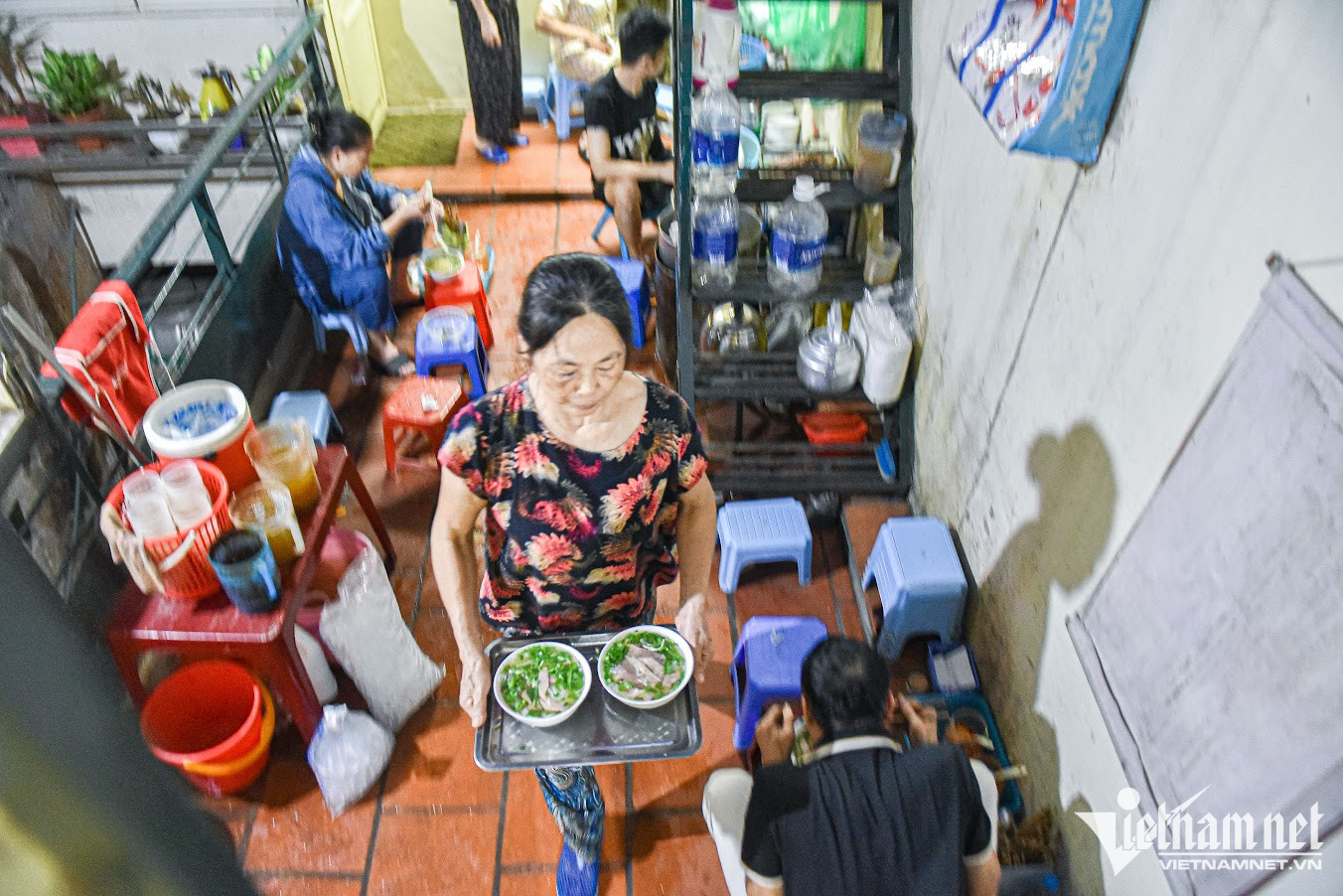 Góc bếp với nồi nước dùng sôi sùng sục, rổ thịt và dụng cụ làm phở nằm ở góc ban công rộng 3 - 4m2. Khu ban công này không có đủ chỗ đặt bàn, thực khách tới ăn phở vẫn giữ thói quen như hồi ngồi vỉa hè - vừa bưng vừa gắp. Ngày mưa, bà chủ đội nón để bán hàng, lấy ô che cho nồi nước phở.
