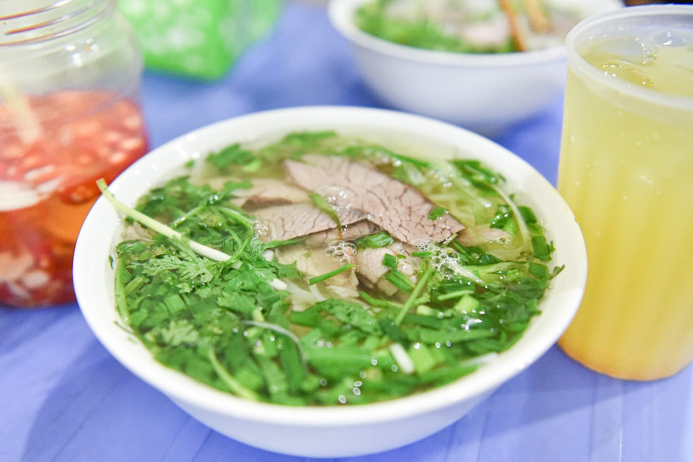 Quán phở không có biển hiệu, không cửa hàng, nằm ngay vỉa hè với một nồi nước dùng, rổ thịt bò, vài chục cái ghế nhựa. Khách xếp hàng gọi đồ rồi tự tay bưng bát phở nóng hôi hổi, nhanh chân tìm ghế trống để ngồi thưởng thức.