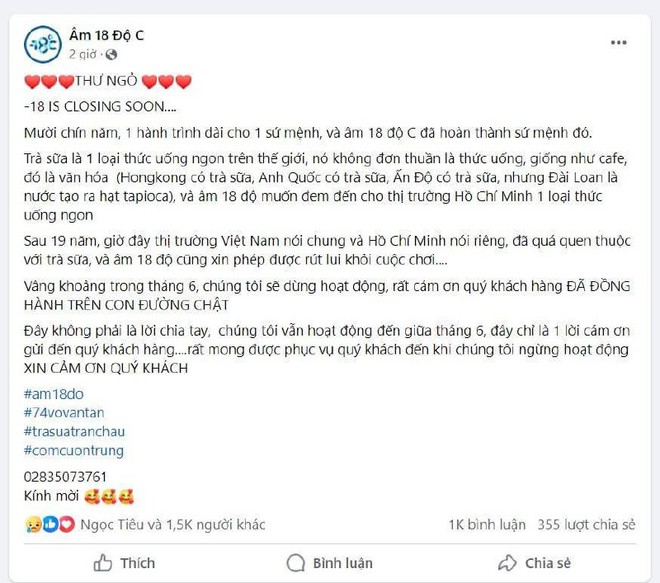 Mới đây, trên fanpage chính thức của thương hiệu -18 độ đã thông báo sẽ chính thức đóng cửa vào tháng 6 tới đây. Biết được thông tin này, cư dân mạng lập tức trở nên xôn xao vì thương hiệu này đã là một phần ký ức của nhiều thế hệ học sinh, sinh viên ở Sài Gòn. Thậm chí những quán trà sữa của -18 độ còn là tuổi thơ của nhiều người vì thương hiệu này đã xuất hiện ngót nghét 19 năm.