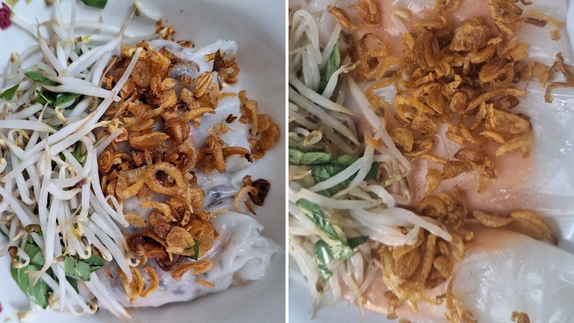 Hành phi quán tự bào xắt và phi vàng cùng dầu chiên loại tốt, chỉ chiên một lần rồi bỏ. Do đó, hành giòn rụm, thơm ngào ngạt, nhai rôm rốp cùng miếng bánh cuốn mềm. Nhân bánh đầy đặn và là sự kết hợp vừa đủ của thịt heo, nấm, sắn chín tới. Nước mắm pha chế vị mặn pha ngọt, hòa cùng ít ớt đỏ do tiệm tự làm hoặc giọt cà cuống thơm lừng, cay nhẹ nhàng.