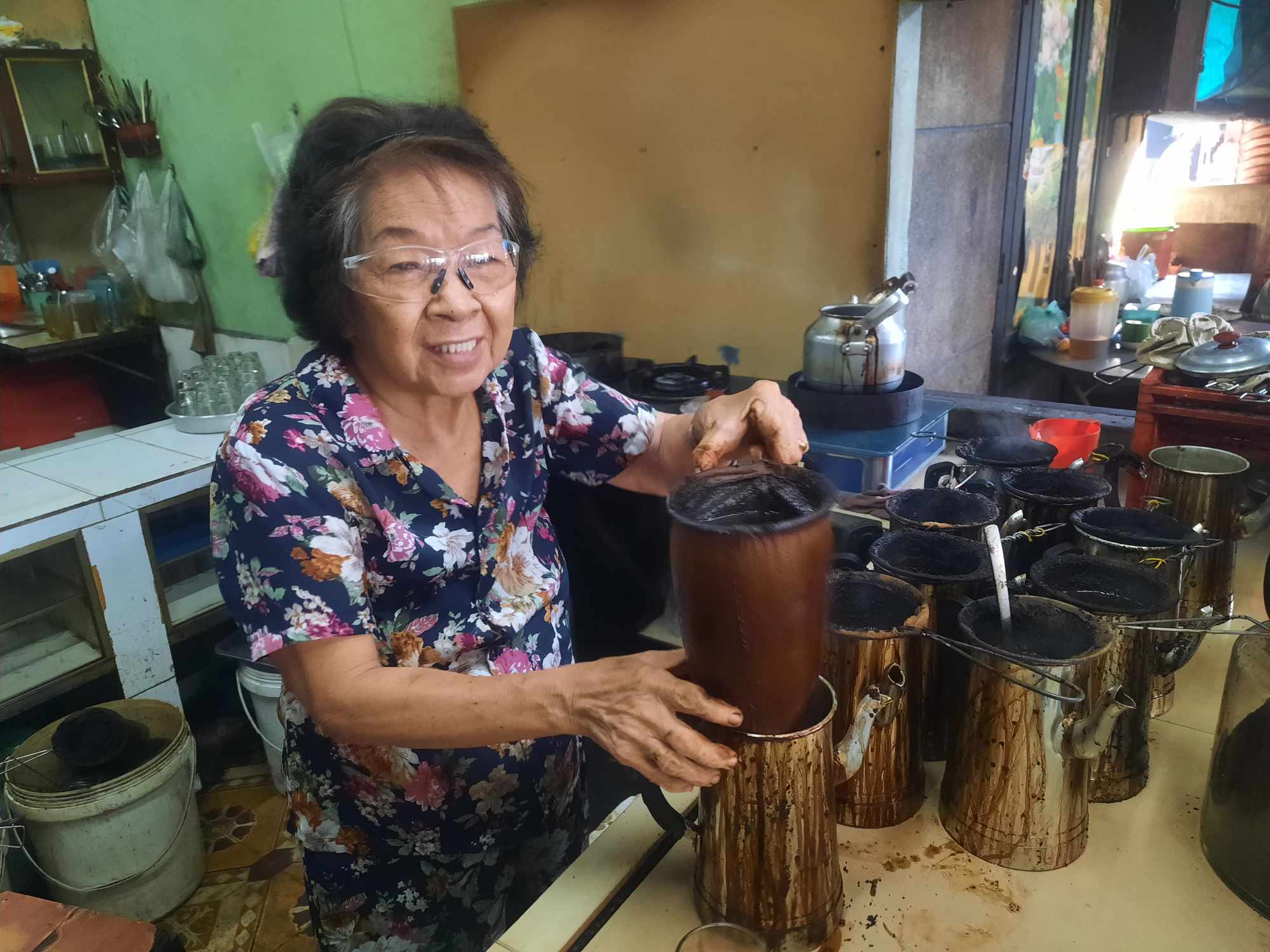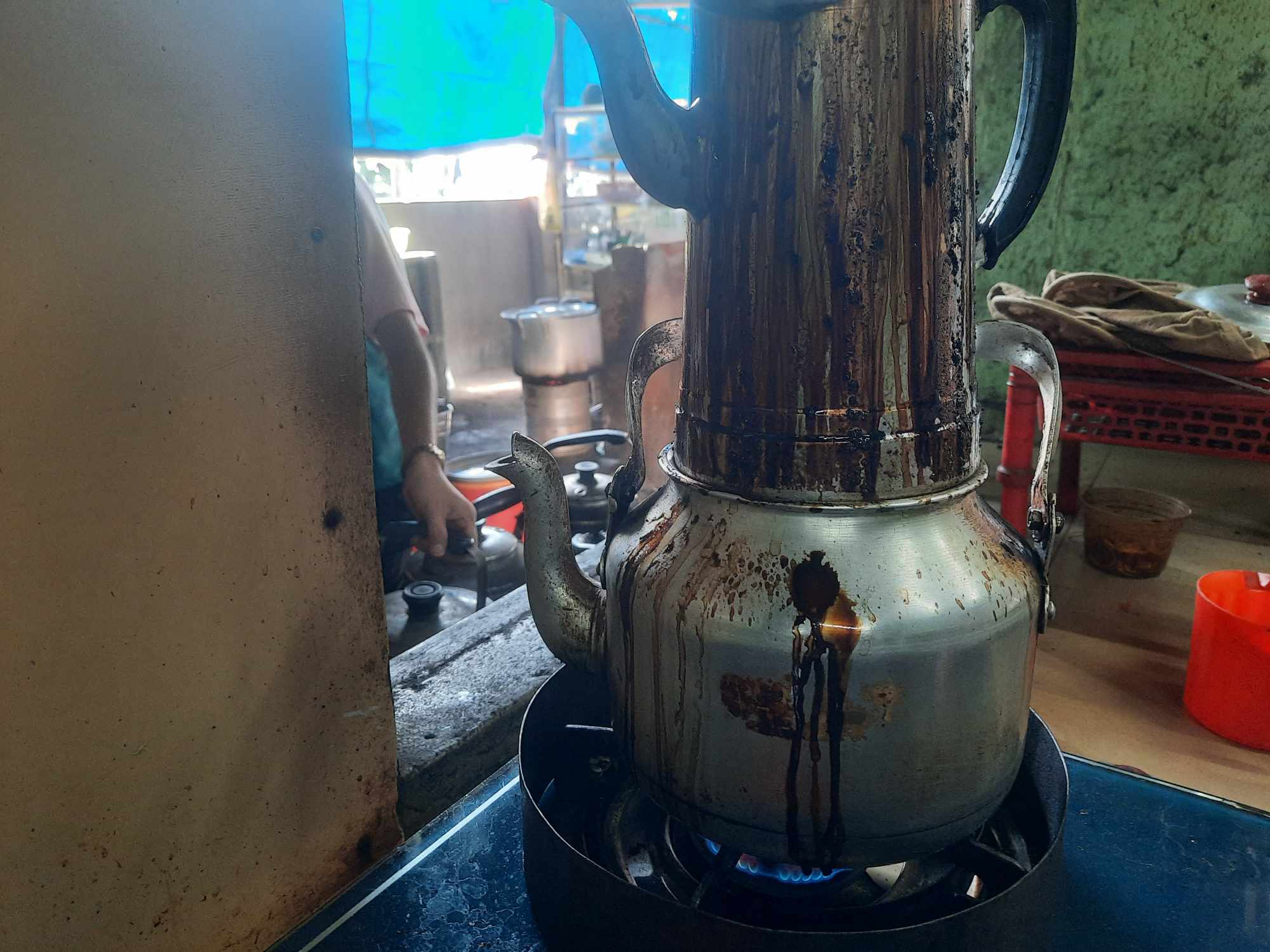 Chúng tôi quan sát tại khu pha chế ngổn ngang nhiều ấm, nồi; trong đó có nhiều ấm, nồi cùng lên lửa một lúc. Về cách pha, đầu tiên phải nhúng vợt vải vào nước đun sôi để vệ sinh vợt. Tiếp đó là múc cà phê đã xay vào vợt, đặt vào ca nhôm, múc nước đun sôi đổ từ từ vào, dùng muỗng khuấy đều cho bột cà phê chín dần, sủi bọt. Đợi một thời gian nhất định, nhấc lên nhúng ba lần như vậy.