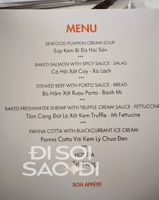 Các món trong tiệc cưới của Diễm My 9x gồm có: Súp kem bí đỏ hải sản, cá hồi sốt cay - xà lách, bò hầm sốt rượu Porto - bánh mì, tôm càng đút lò sốt kem truffle - mì fettuccine, panna cotta với kem lý chua đen và trà nóng.