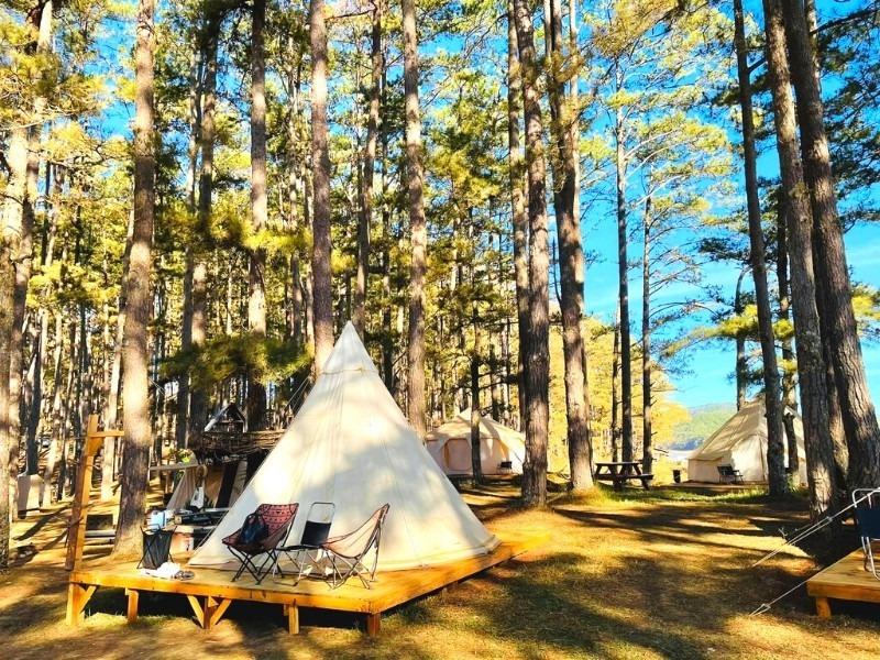 Nơi đây vừa có hồ nước trong xanh và bao quanh là những khu đồi thông gia, một khung cảnh quá đỗi tuyệt vời để cắm trại qua đêm. Đặc biệt vào mùa cỏ hồng thì bạn nhất định phải đến đây để trải nghiệm một lần. Sáng thức giấc, bạn như được hòa mình với chốn tiên cảnh, một “thảm hồng” trải dài lung linh trong sương sớm.