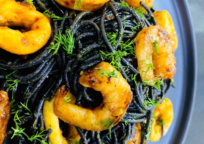 Một món ăn mang màu đen độc đáo mà bạn không nên bỏ qua đó chí là Spaghetti mực. Nếu nhìn từ xa, chắc chắn bạn sẽ bị nhầm lẫn chúng với món mì đen đặc trưng của người Hàn Quốc. Những sợi mỳ màu đen óng ả được sốt với mực kết hợp với các loại hải sản tươi ngon như tôm, mực, thêm ít nấm và đậu hà lan chắc chắn sẽ đánh thức vị giác của bạn ngay lập tức.