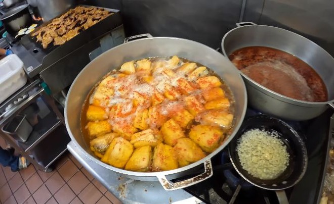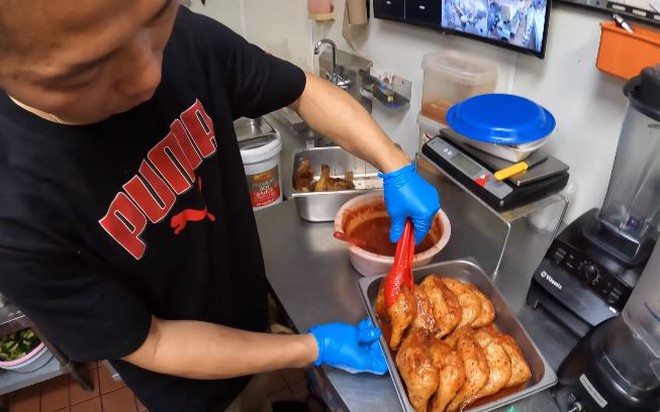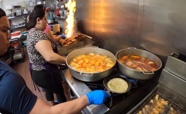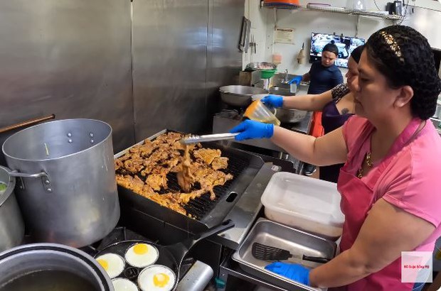3 phụ bếp người Mexico, người ôm bếp chiên, người làm sườn cốt lết nướng, người chuyên làm món xào, rang và kho tộ. Anh Bình chủ tiệm sẽ nêm nếm, kiểm soát chất lượng và hương vị chung.