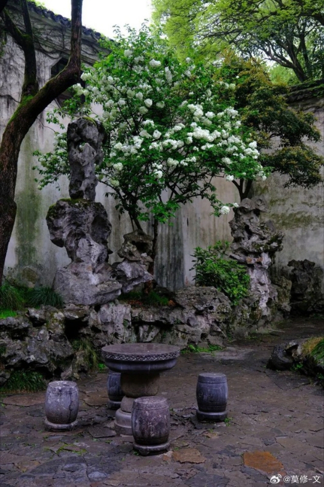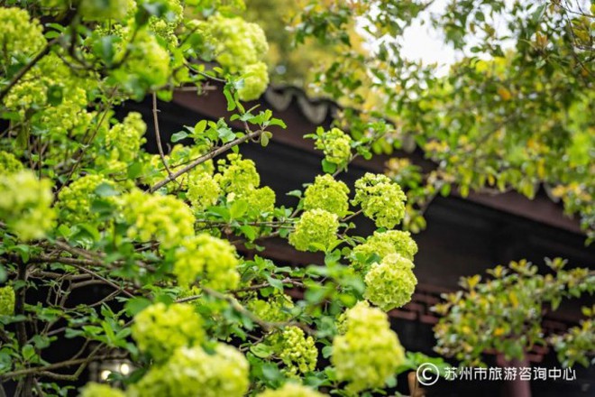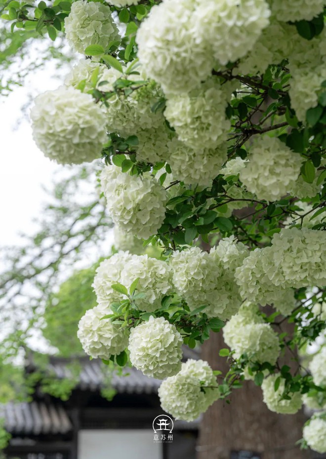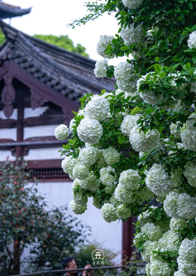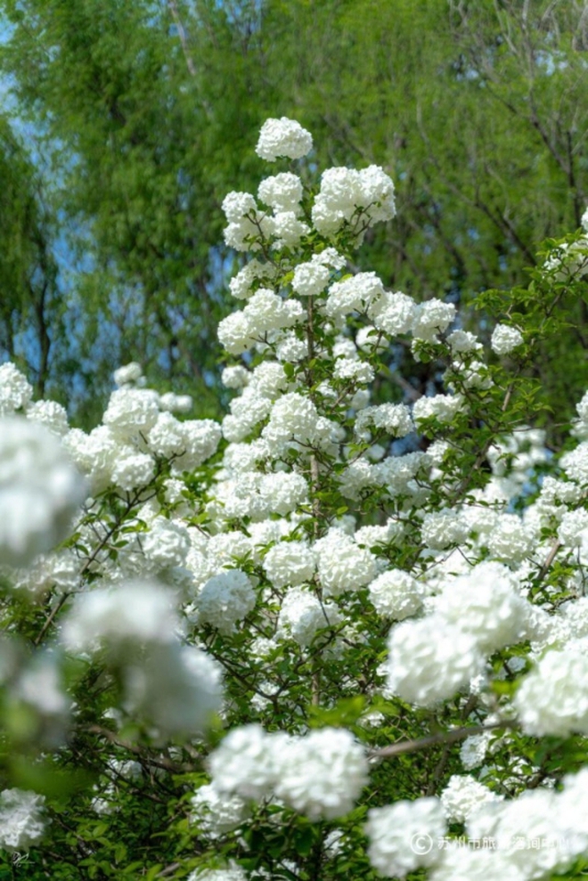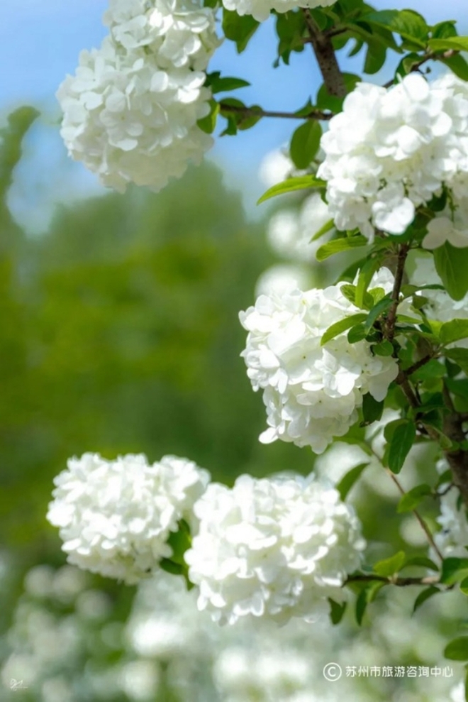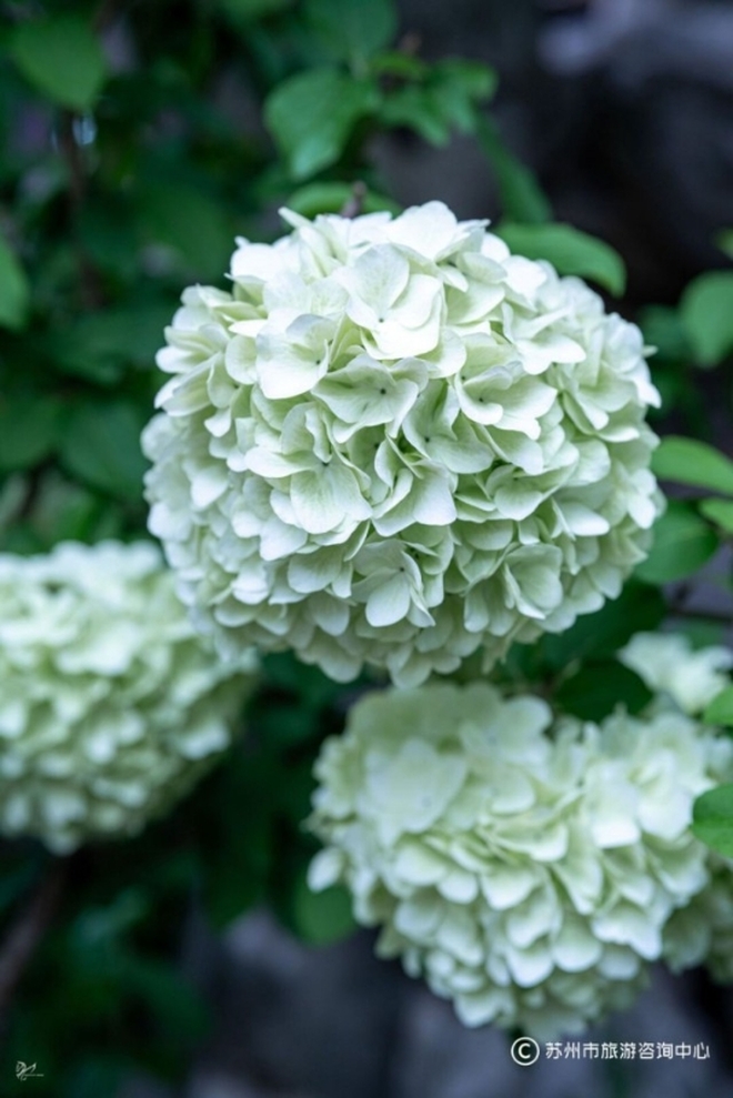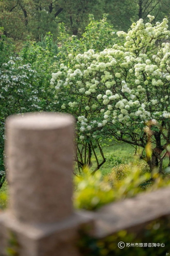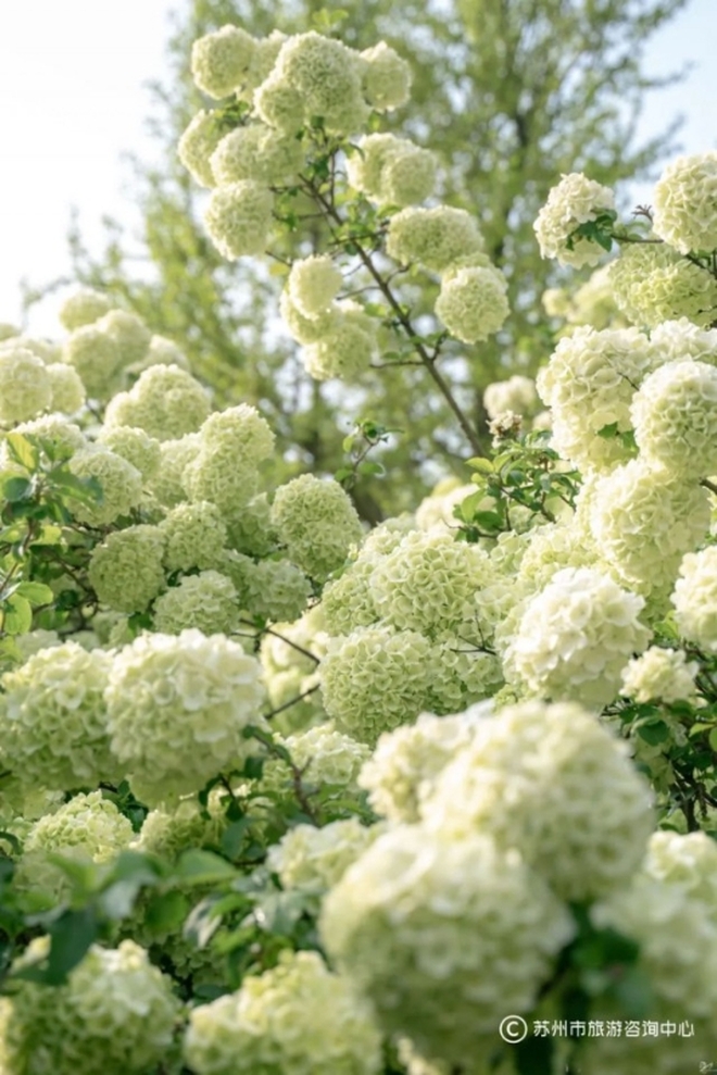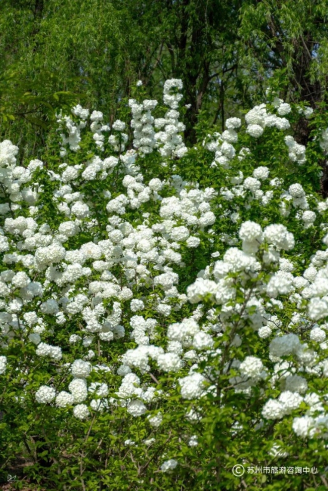 Mộc tú cầu trong công viên này đang độ hoa nở đẹp nhất trong năm, hoa đã trắng muốt như tuyết. Dường như được khí hậu trong công viên ưu đãi nên những cây mộc tú cầu trong khu vực này sinh trưởng rất tốt, hoa nở dày đặc, có thể nói là sinh sôi mạnh nhất Tô Châu.