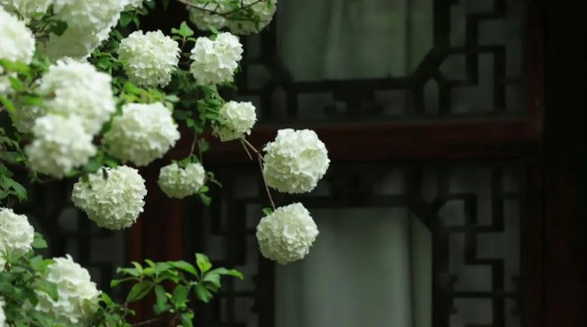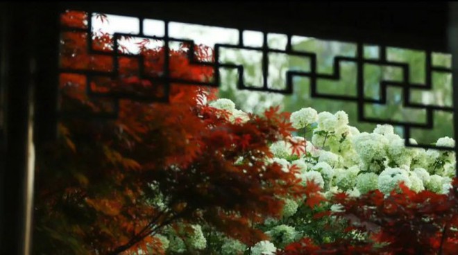 Gió xuân thổi hiu hiu, cành lá phong đỏ đu đưa xào xạc bên cạnh mộc tú cầu nở rộ trắng xanh. Nhìn cảnh đẹp qua khung cửa nhỏ mang phong cách kiến trúc cổ, ai mà chẳng thích đúng không!