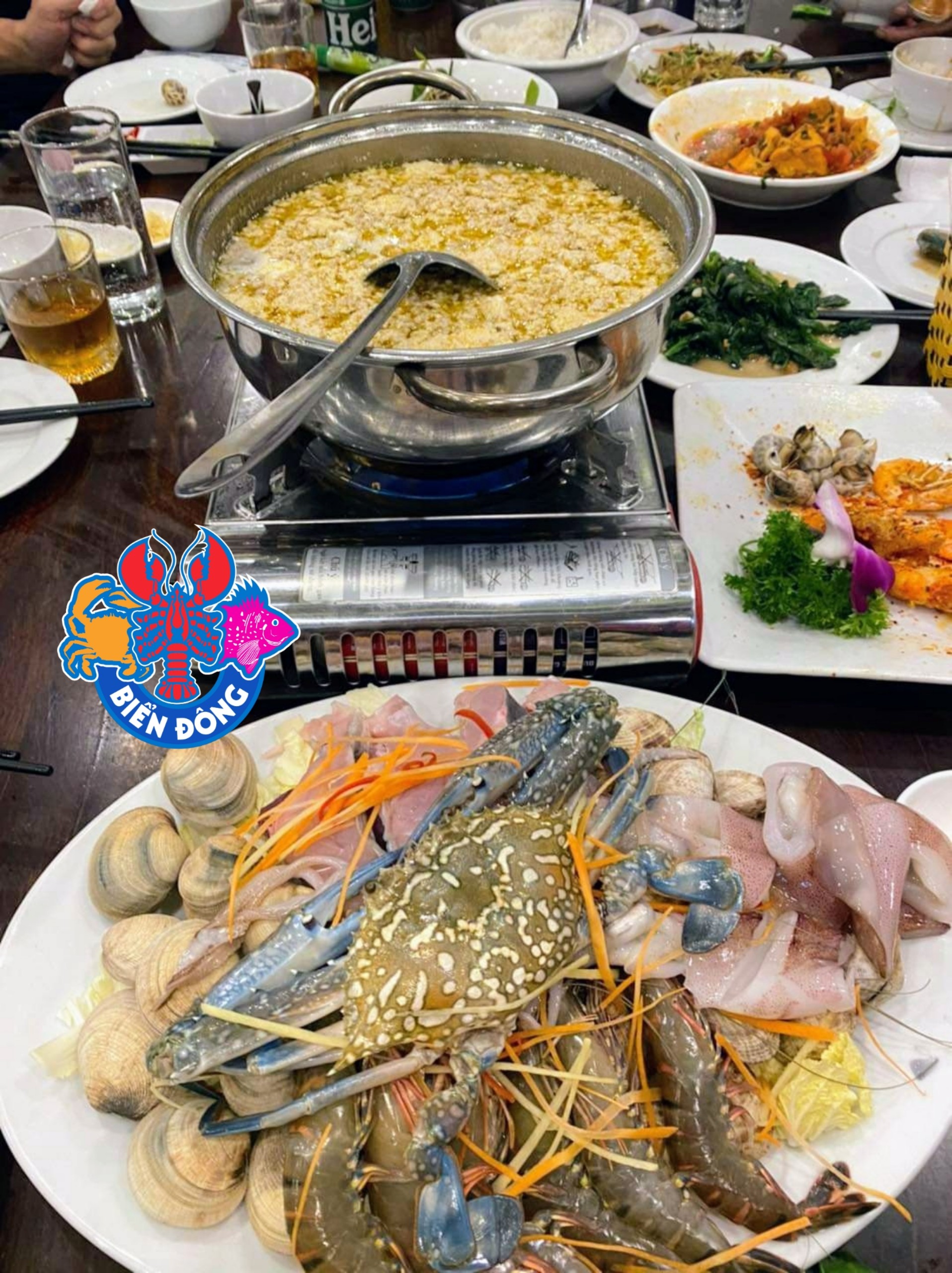 Nhà hàng Hải Sản Biển Đông đang bán khuyến mại set nước lẩu riêu cua biển kèm rau theo mùa hơn 15 loại, nấm, váng đậu, mỳ, đậu phụ... giá chỉ 170k/set.