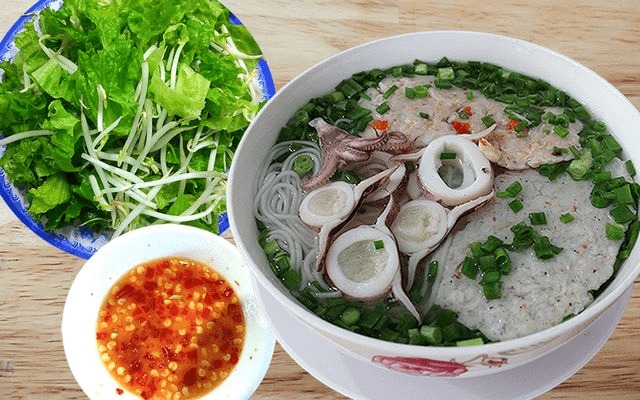 Món đặc sản trứ danh này gồm mực, chả tôm và chả cá... kèm nước lèo trong ăn cùng nước chấm tự pha gồm muối, bột ngọt (mì chính), đường, trái tắc (quất), ớt xay. Tất cả cho vào bát và phải quậy thật mạnh để các gia vị sánh lại, chuyển sang màu đỏ cam. Thực khách sẽ chan lên bát bún để dùng và tuỳ vào khẩu vị mà bạn có thể gia giảm tuỳ ý. Tuy nhiên muốn nước chấm ngon nhất bạn phải thêm nhanh và khuấy đều tay ít nhất 5 phút.