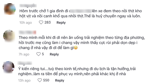 Theo đó, có một số ý kiến cho rằng, nếu đã đi du lịch thì nên thưởng thức đặc sản địa phương, như vậy chuyến đi mới thật sự mang tính chất du lịch, trải nghiệm. Còn nếu mang theo đồ ăn từ nhà thì lại không quá khác biệt với khi ở nhà. Hay có bạn trẻ chia sẻ rằng thấy mẹ chuẩn bị đồ ăn để mang đi như vậy sẽ rất mệt nên muốn mẹ được nghỉ ngơi và đi du lịch thì sẽ trải nghiệm đặc sản địa phương. Thậm chí, có ý kiến của một cư dân mạng (tự nhận là tài xế ô tô) cho biết, khi thấy có vị khách mang đồ ăn lên xe thì đã huỷ chuyến bởi có thể làm bẩn, bốc mùi trong xe, ảnh hưởng rất nhiều tới công việc.