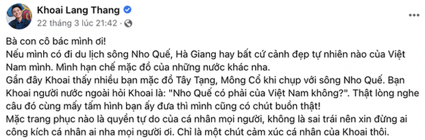 Trước đây, vấn đề mặc trang phục sai tại các địa điểm du lịch cũng từng được travel blogger Khoai Lang Thang lên tiếng. Theo đó, anh kêu gọi các "bà con, cô bác" hãy hạn chế mặc trang phục nước khác.