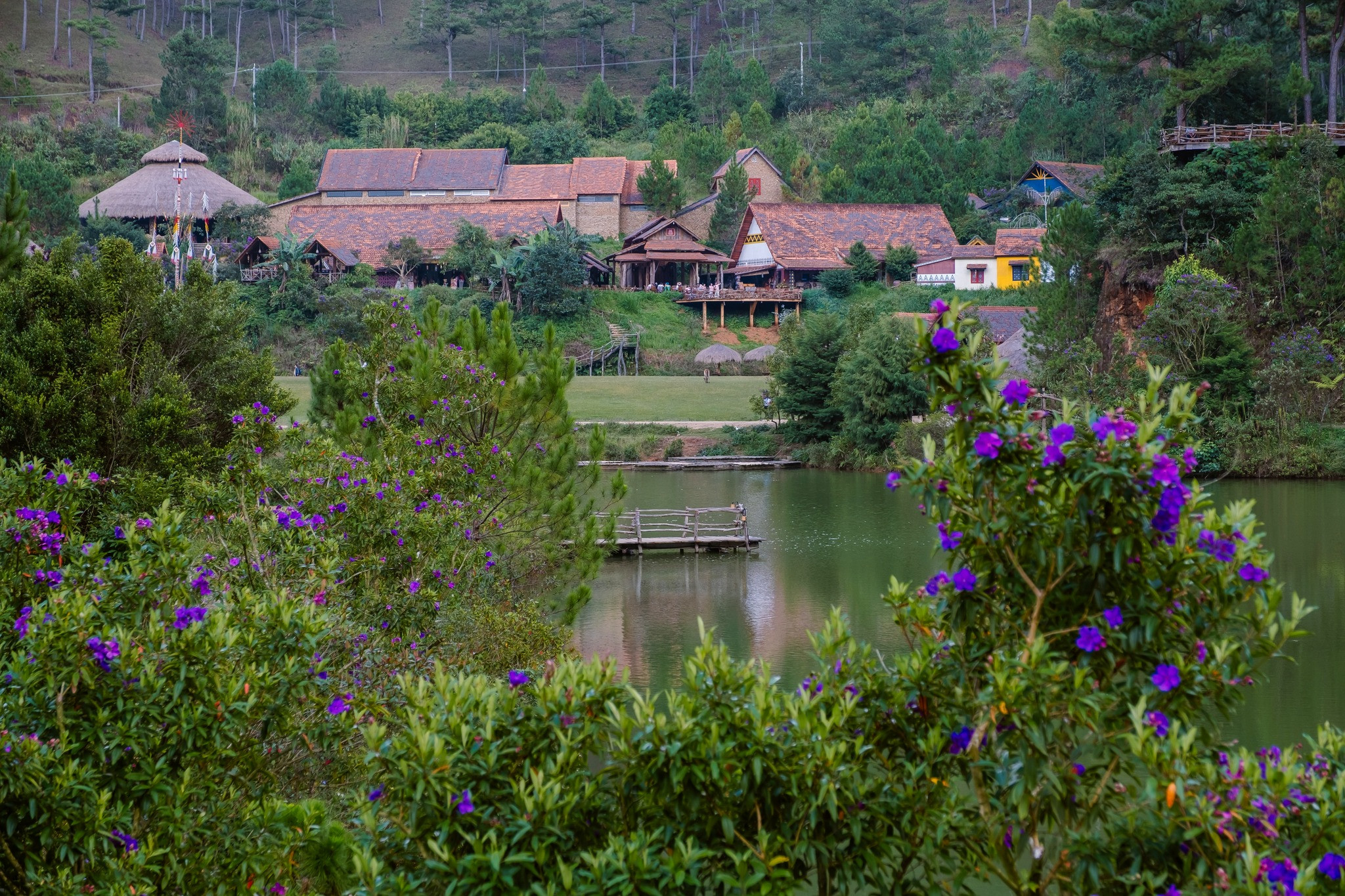 Loại cây chủ đạo được trồng dọc hai bên lối đi vào làng là cây cù lần xen với hoa kim châm vàng rực. Trên đường đi là những ngôi nhà sàn với mái tranh, trụ gỗ đế trống vách.