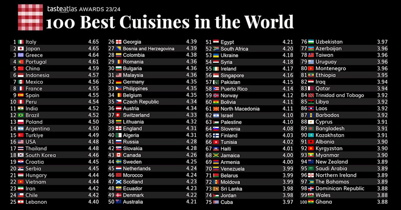 100 Best Cuisines in the World là bảng xếp hạng nằm trong khuôn khổ giải thưởng thường niên Taste Atlas Awards, dựa trên sự bình chọn và chấm điểm của các chuyên gia ẩm thực, đầu bếp, thực khách khắp thế giới. Năm 2023, có hơn 400.000 phiếu bầu và chấm điểm các nền ẩm thực gửi cho sự kiện này. Tiêu chí xếp hạng dựa trên tổng điểm của hơn 50 món ăn cùng các sản phẩm ẩm thực địa phương.