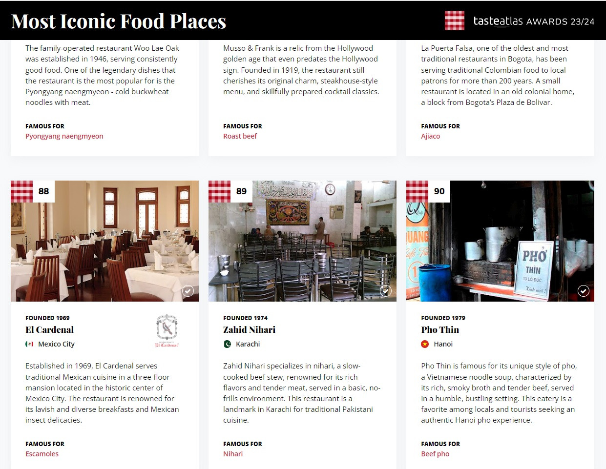 Cuối cùng là hạng mục Best Iconic food places (Những điểm đến ẩm thực mang tính biểu tượng), hàng phở Thìn Lò Đúc được mở từ năm 1979 cũng được các chuyên gia của TasteAtlas xếp hạng 90 với món phở bò xào tái lăn độc đáo, thấm đẫm hương vị.