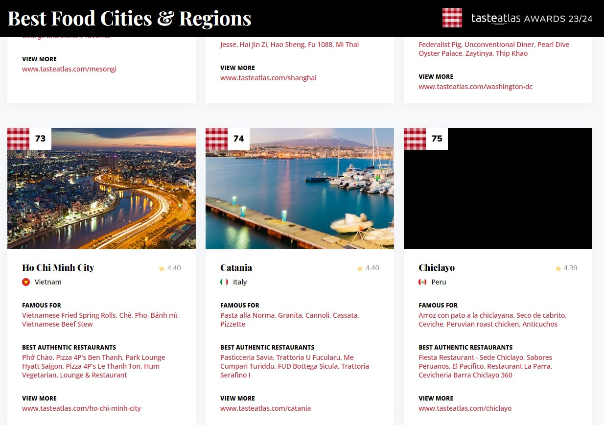 Hai điểm đến với nền ẩm thực đa dạng, hấp dẫn khác của đất nước chúng ta là Huế (thứ 28) và Thành phố Hồ Chí Minh (thứ 73) cũng góp mặt trong hạng mục Best Food Cities & regions (Những thành phố, khu vực có đồ ăn ngon nhất).