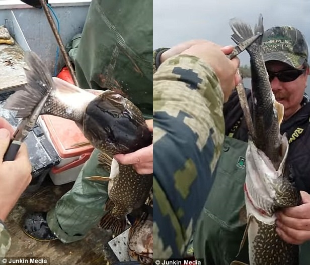 Video trên quay lại cảnh hai ngư dân Canada câu được một con cá với con khác to gần bằng trong mồm.
