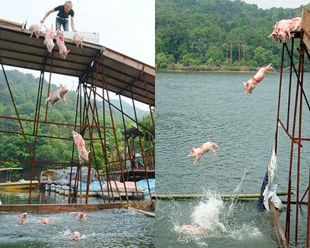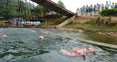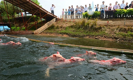 Sina đưa tin, trước đó, những chú heo đã được huấn luyện một cách đặc biệt để “thi đấu”. Dưới sự quan sát của huấn luyện viên, 10 chú heo được đánh số thứ tự "dũng cảm" lao mình xuống dòng nước từ một cây cầu và cố gắng bơi đến đích để giành giải nhất.