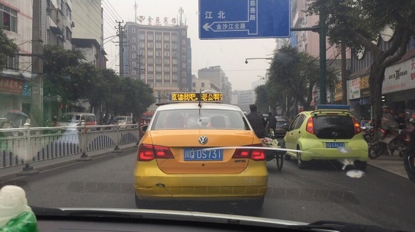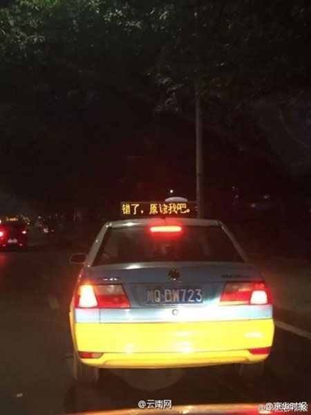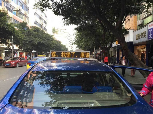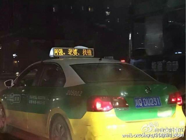 Bắt đầu từ buổi chiều ngày 2/1, dư luận thành phố Nghi Tân, tỉnh Tứ Xuyên, Trung Quốc bỗng trở nên xôn xao khi tất cả các đèn led trên xe taxi tại khu trung tâm thành phố đều xuất hiện dòng chữ: "Vợ ơi, anh sai rồi. Hãy tha thứ cho anh nhé! A Cường".