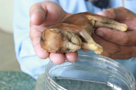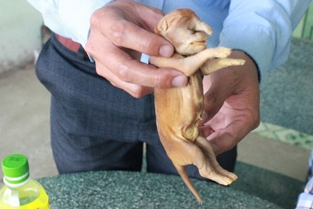 Tuy nhiên, đáng tiếc là sau đó, con chó mẹ đã cắn chết ngay con, có lẽ do thấy hình dáng con kỳ lạ. Sau đó, anh Khương đã đem con chó con ngâm vào bình rượu. Đến nay, đã 17 năm, chú chó vẫn giữ nguyên hình hài ban đầu. Lâu lâu chủ nhân lại mang ra kể với bạn bè.