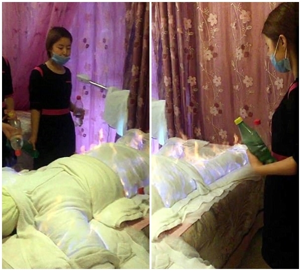 Chủ tiệm làm đẹp cũng nêu chi tiết từng bước của phương pháp này bao gồm đặt hai lớp khăn ướt lên cơ thể khác hàng trước khi xịt rượu và nước lên trên khăn rồi đốt. Khách hàng được khuyến khích thực hiện 10 lần để đạt hiệu quả tốt nhất.