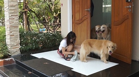 Từ đoạn video có thể thấy người phụ nữ đứng chờ trước cửa, tại đây, 4 chú chó vàng lần lượt đứng xếp thành hàng dọc ngay ngắn để chờ được lau rửa chân trước khi vào nhà. Đáng chú ý, những chú cún này đều rất có ý thức khi tự giác đứng chờ, không chen lấn, xô đẩy.