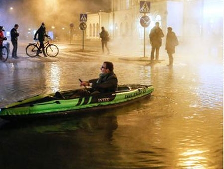 Nước dâng cao nên nhiều người dân dùng thuyền để di chuyển trên phố. Ảnh: TT