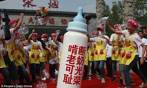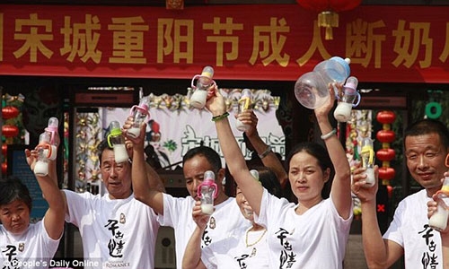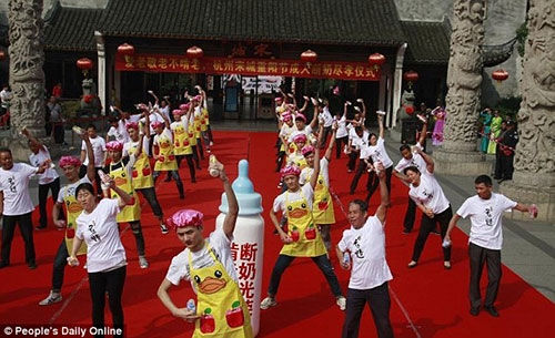 Để chào mừng lễ hội Double Ninth - một dịp truyền thống của người Trung Quốc để tỏ lòng tôn kính với người già, khu lịch ở thành phố Hàng Châu đã quyết định tổ chức nghi lễ “cai sữa” kỳ lạ dành cho những đàn ông từ 23 đến 30 tuổi.