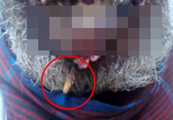 Một con dòi cỡ bự còn "chu du" xuống dưới bộ râu. |